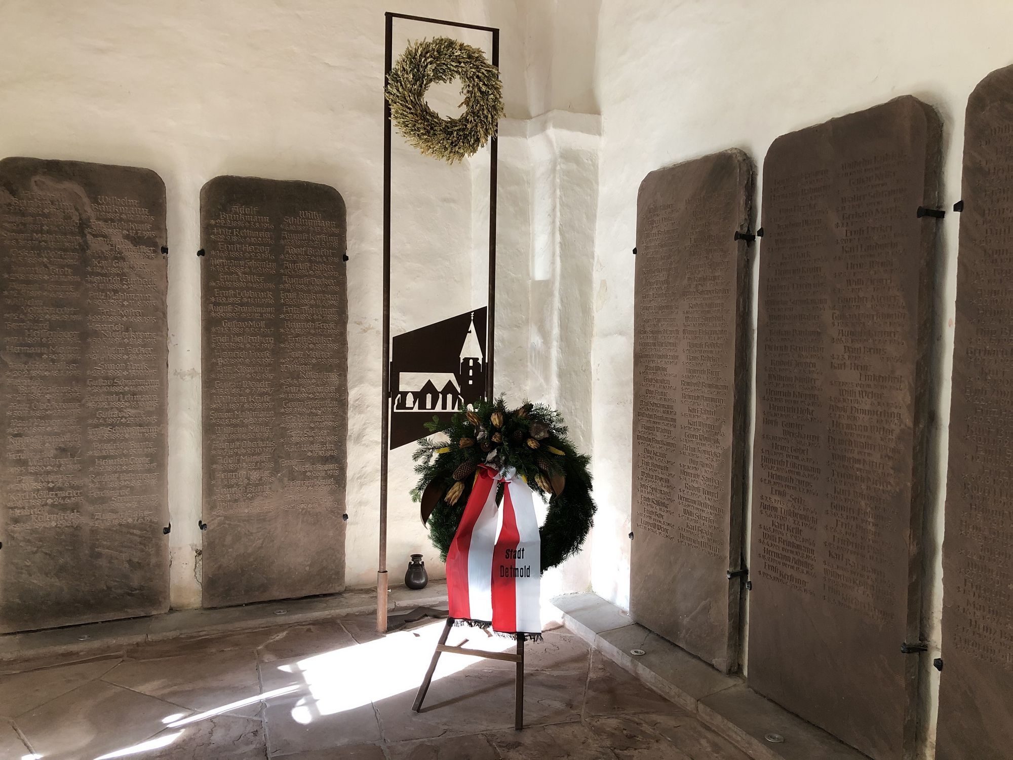 Am Volkstrauertag legen gewöhnlich Vertreter der Stadt und der Vereine einen Kranz im Turm der Kirche nieder. So gedenkt Heiligenkirchen der Opfer von Krieg und Gewaltherrschaft. In diesem Jahr war das aufgrund der Pandemie nicht möglich. Mitglieder der Kirchengemeinde übernahmen die Aufgabe und trugen den Kranz nach dem Gottesdienst von der Kanzel zum Mahnmal im Turm. „Mich berührt es immer besonders, die Namen von Christa und Rudolf Hille auf den Gedenksteinen zu lesen“, sagt Pastorin Wiltrud Holzmüller. „Die Geschwister waren 6 bzw. 15 Jahre alt, als sie in den letzten Kriegstagen in Heiligenkirchen ums Leben kamen.“