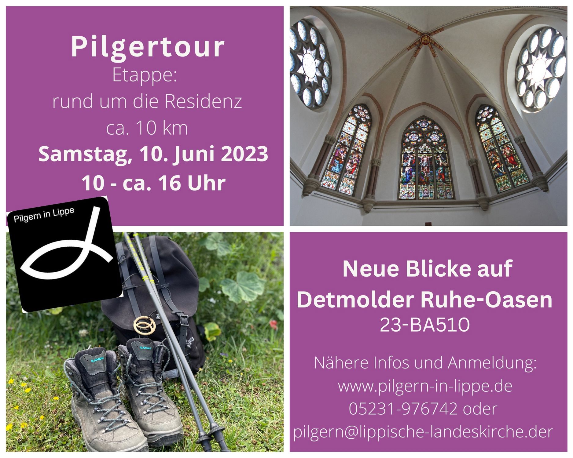 Anmeldung: bis 02.06.2023 unter pilgern(@)lippische-landeskirche.de oder mit diesem Link: Detmolder Ruhe-Oasen