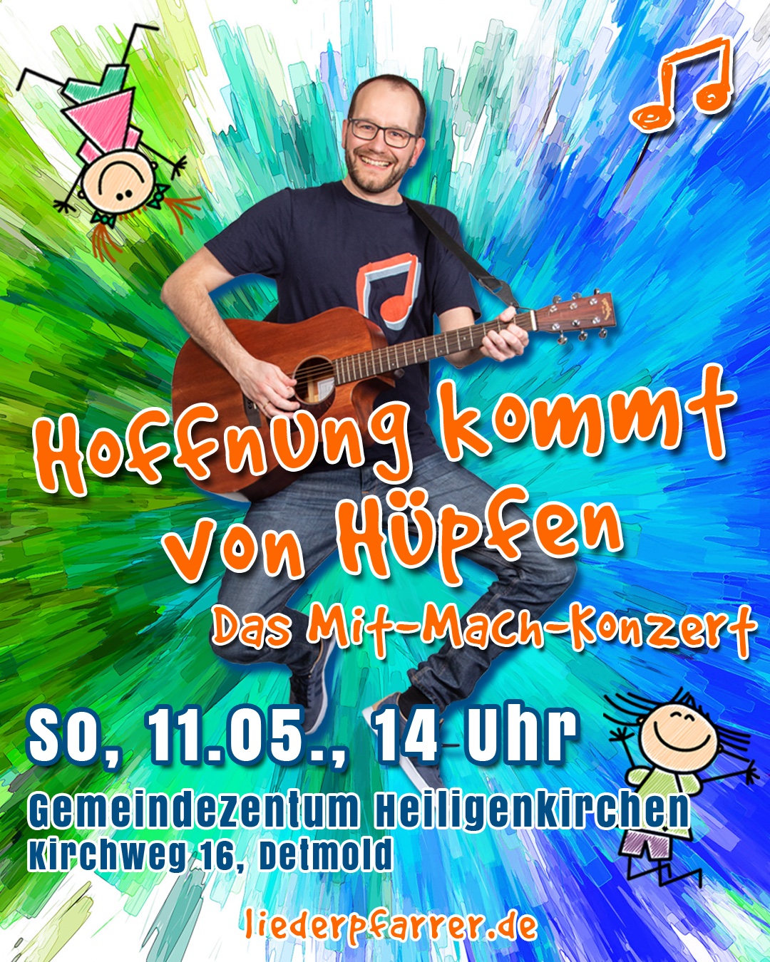 Die Kirchengemeinde freut sich auf viele Familien aus Heiligenkirchen, Berlebeck und Umgebung. Übrigens: Mit einem seiner Alben hat Bastian Basse beim Deutschen Rock und Pop Preis 2023 den Preis für das beste Kinderlieder-Album gewonnen. Also: Don’t forget to hüpf!